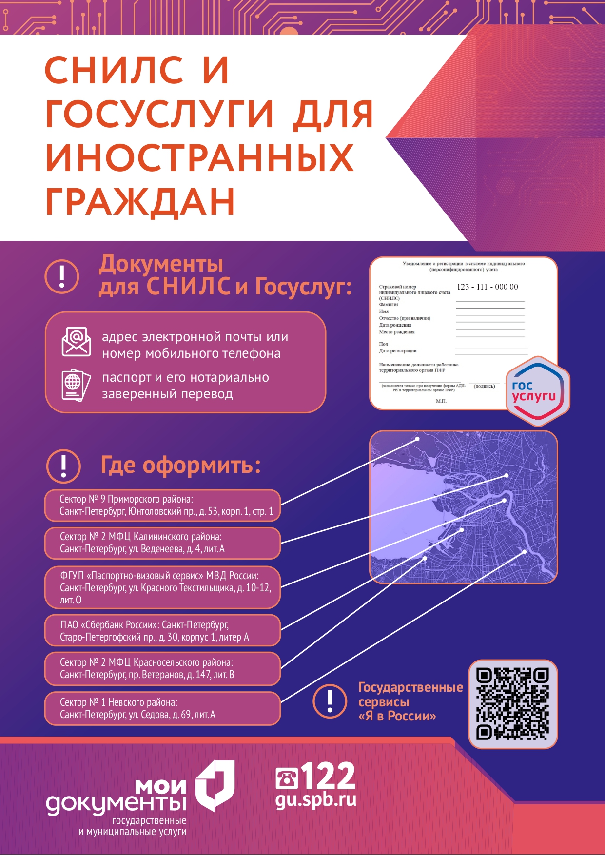 С 27.06.2025 два МФЦ Санкт-Петербурга перепрофилированы для работы с иностранными гражданами и лицами без гражданства но оформлению страхового номера индивидуального лицевого счета (СНИЛС), ИНН и получения доступа к учетной записи ЕСИА.