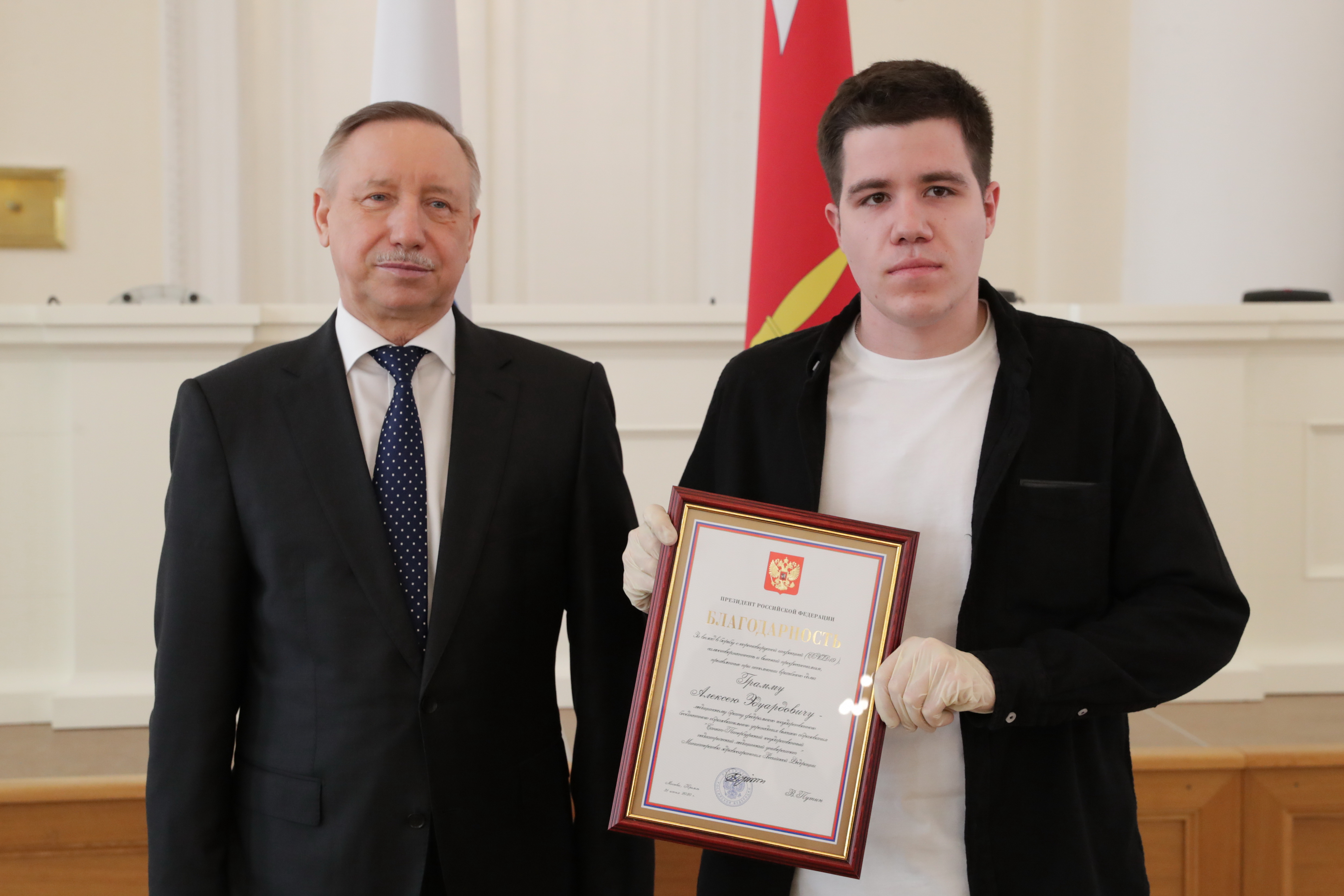 По поручению Владимира Путина правительственными грамотами наградили врачей Елену Гаврилову, Евгению Гольцман, Анну Набиеву, Алису Перерослую, Екатерину Соловьеву, заведующего отделением анестезиологии-реанимации Евгения Фелькера, а также заведующую лабораторией вуза Лилию Марапулец. Кроме того, 12 сотрудников СПбГПМУ получили из рук градоначальника благодарности Президента.