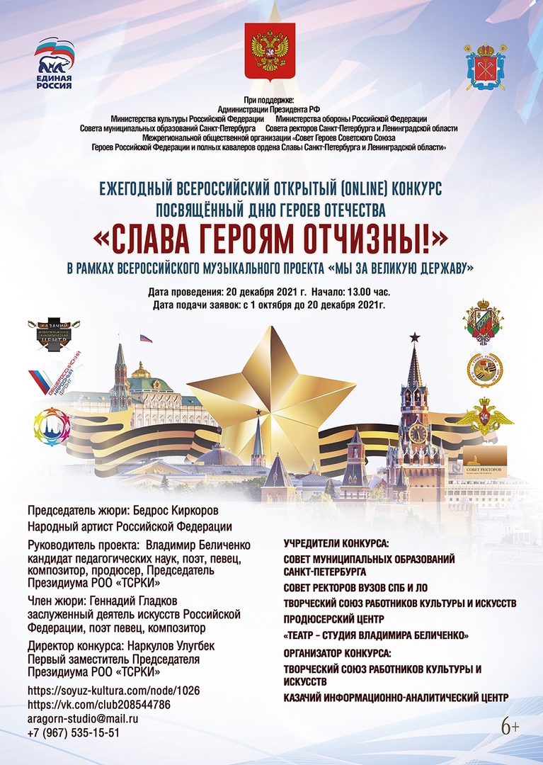 Ежегодный Всероссийский открытый дистанционный (online) конкурс, посвящённый дню героев Отечества, «Слава Героям Отчизны!» проводится в рамках Всероссийского творческого проекта «Мы за Великую Державу». Конкурс состоится 20.12.2021 г. и приурочен к государственному празднику, Дню Героев Отечества, отмечаемому ежегодно в России 9 декабря.