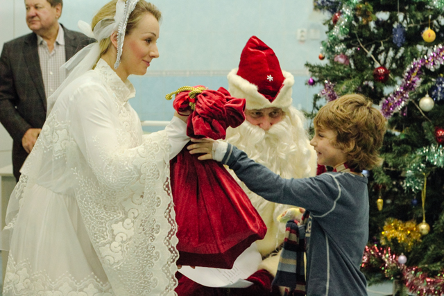 На празднике собрались пациенты разных возрастов, оказавшиеся на новогодние праздники в больнице. Дед Мороз со Снегурочкой пели вместе с детьми песни и вручили им долгожданные подарки.