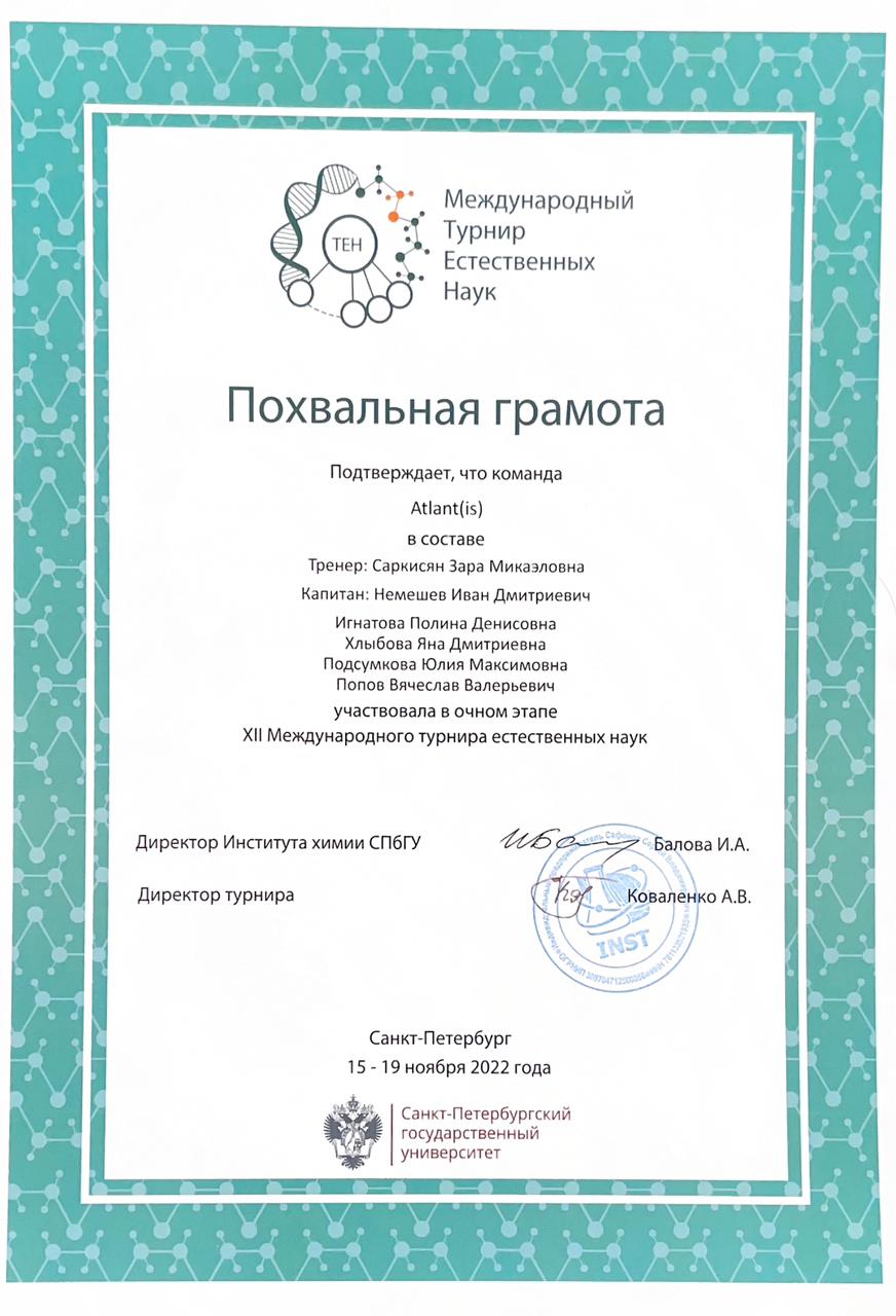 В этом году турнир прошёл в 12-й раз. Педиатрический университет представила команда Atlant(is), капитаном которой стал Иван Немешев, а в число участников вошли Полина Игнатова, Яна Хлыбова, Юлия Подсумкова и Вячеслав Попов. В качестве наставника выступила заведующая кафедрой общей химии СПбГПМУ Зара Саркисян.