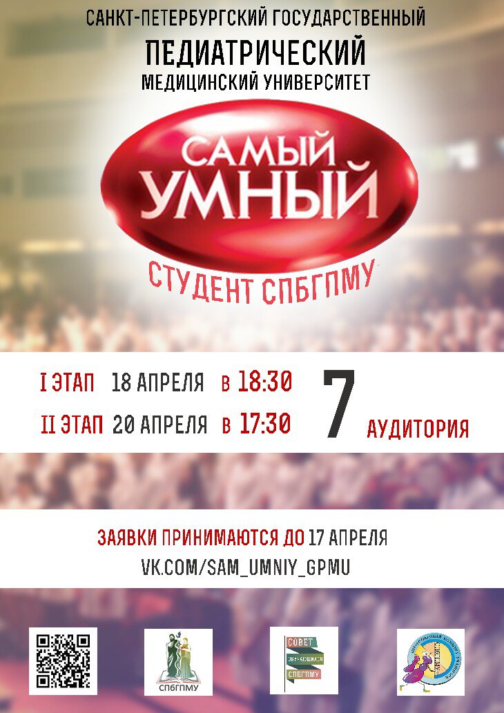 Ты студент СПбГПМУ? Тогда у тебя есть возможность проверить свою эрудицию, а также отлично провести время в рамках интеллектуальной викторины «Самый умный». Победители состязания получат ценные призы, а каждого участника и зрителя ждут приятные сюрпризы. Не пропусти. Мы ждем именно тебя!