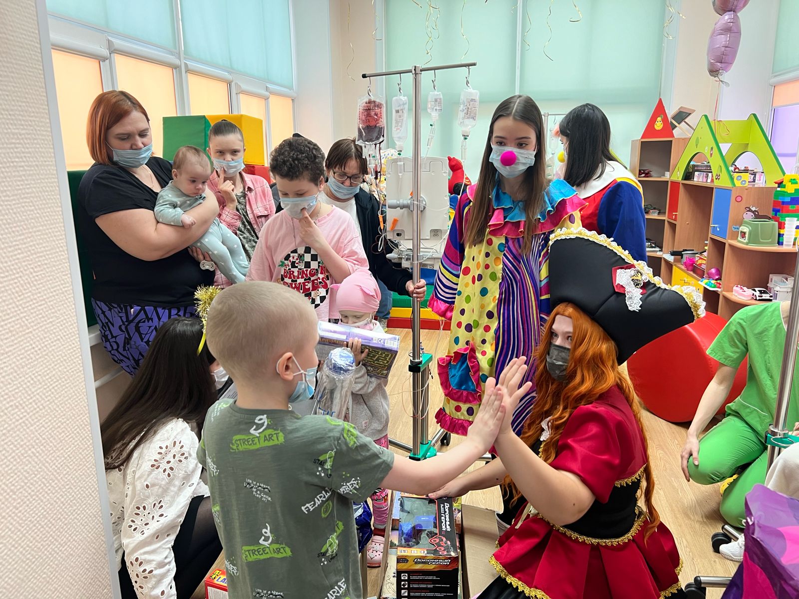 Для пациентов клиники организовали развлекательную программу, детям вручили подарки - игрушки, машинки на дистанционном управлении, конструкторы, наборы для творчества. Аниматорам удалось приободрить и порадовать малышей и их родителей.