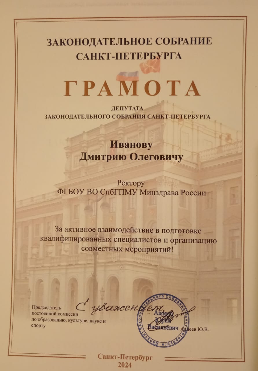 Также было подчёркнуто, что вуз проводит многостороннюю патриотическую и воспитательную работу с молодёжью, что неразрывно связано с формированием гражданских качеств у будущих докторов. Юрий Авдеев напомнил, с каким успехом в 2023 году прошло заседание Клуба знаменитых чемпионов Санкт-Петербурга в стенах университета, а также практических решениях, которые были тогда определены и воплощаются в работе.