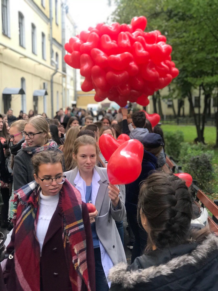 Обучающиеся Педиатрического университета провели красочную акцию, стартовавшую с небольшой кардио-разминки. В конце мероприятия все желающие могли угоститься яблоками, а также получить в подарок воздушный шар в виде сердца. Но на этом студенческая акция не закончилась. Ребята организовали специальный плакат, на котором любой желающий смог оставить свое теплое пожелание маленьким пациентам клиники СПбГПМУ.