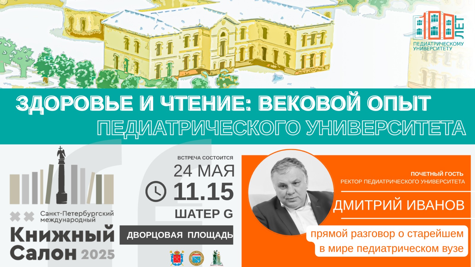 В субботу, 24 мая, в 11:15 в шатре G выступит почетный гость книжного салона, ректор СПбГПМУ Дмитрий Иванов, который проведет прямой разговор о старейшем педиатрическом вузе планеты.