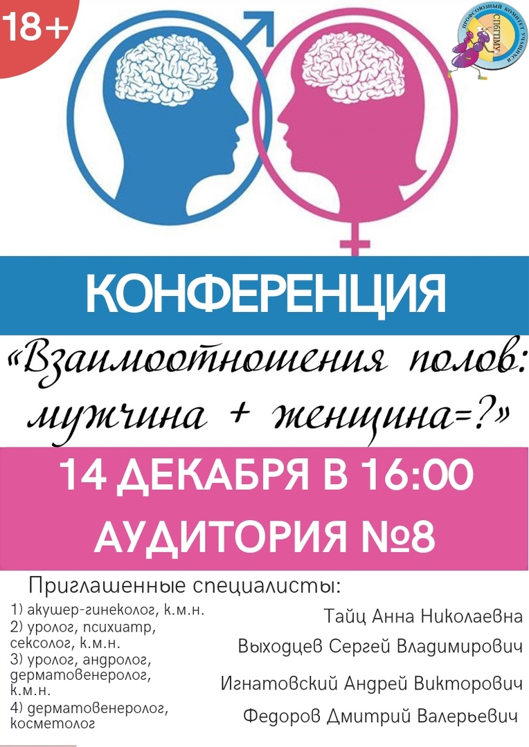 14 декабря в 8 аудитории в 16:00 состоится ежегодная конференция по гинекологии и сексологии "Взаимоотношения полов: мужчина + женщина = ?".