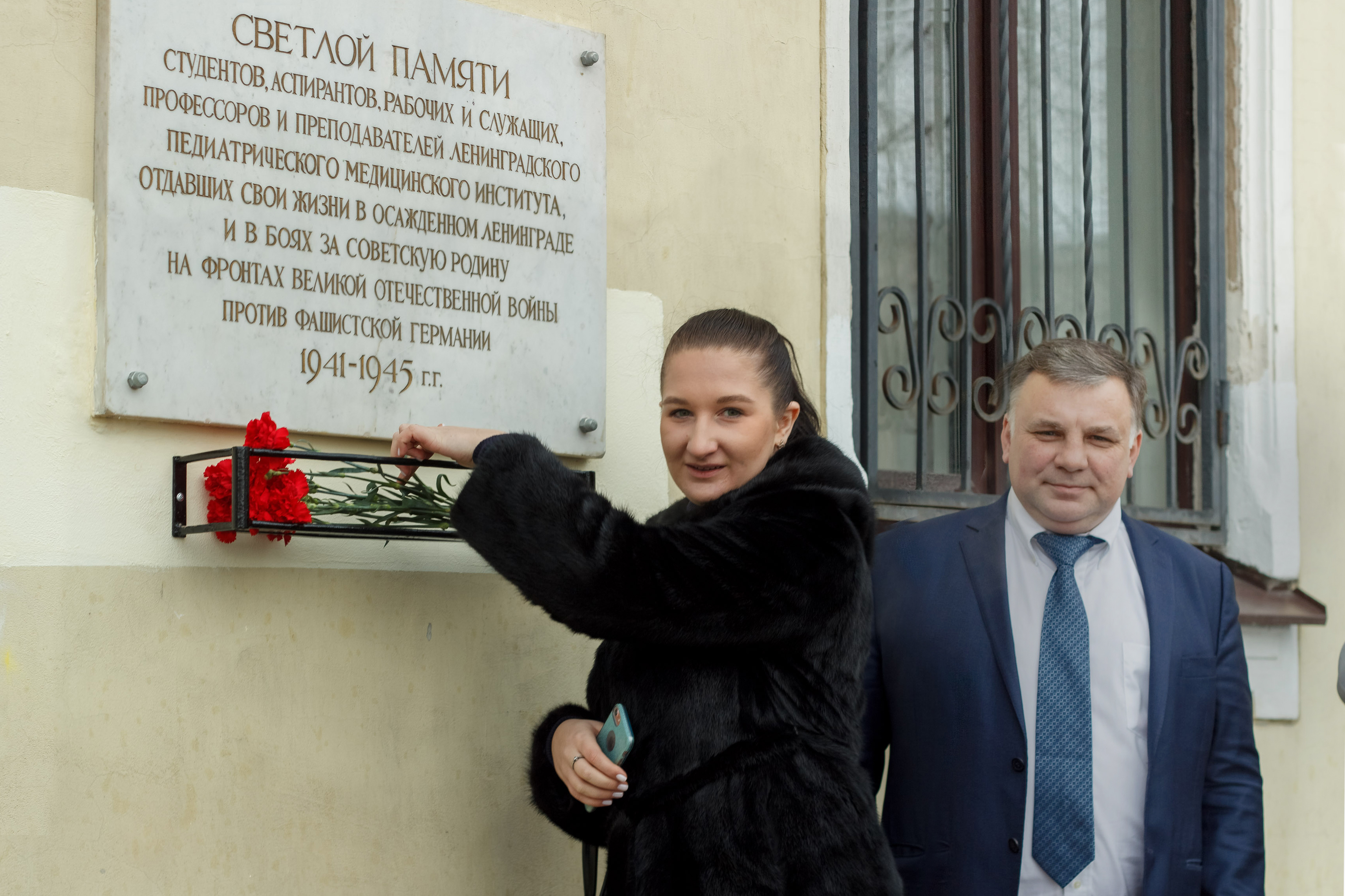 Также и.о. ректора Педиатрического университета Дмитрий Олегович Иванов совместно со студентами возложил цветы к памятной доске на территории Педиатрического университета, посвященной  студентам, аспирантам, рабочим и служащим, профессорам и преподавателям Ленинградского педиатрического медицинского университета, отдавшим свои жизни в осажденном Ленинграде и в боях за советскую Родину на фронтах Великой отечественной войны против фашистской Германии.