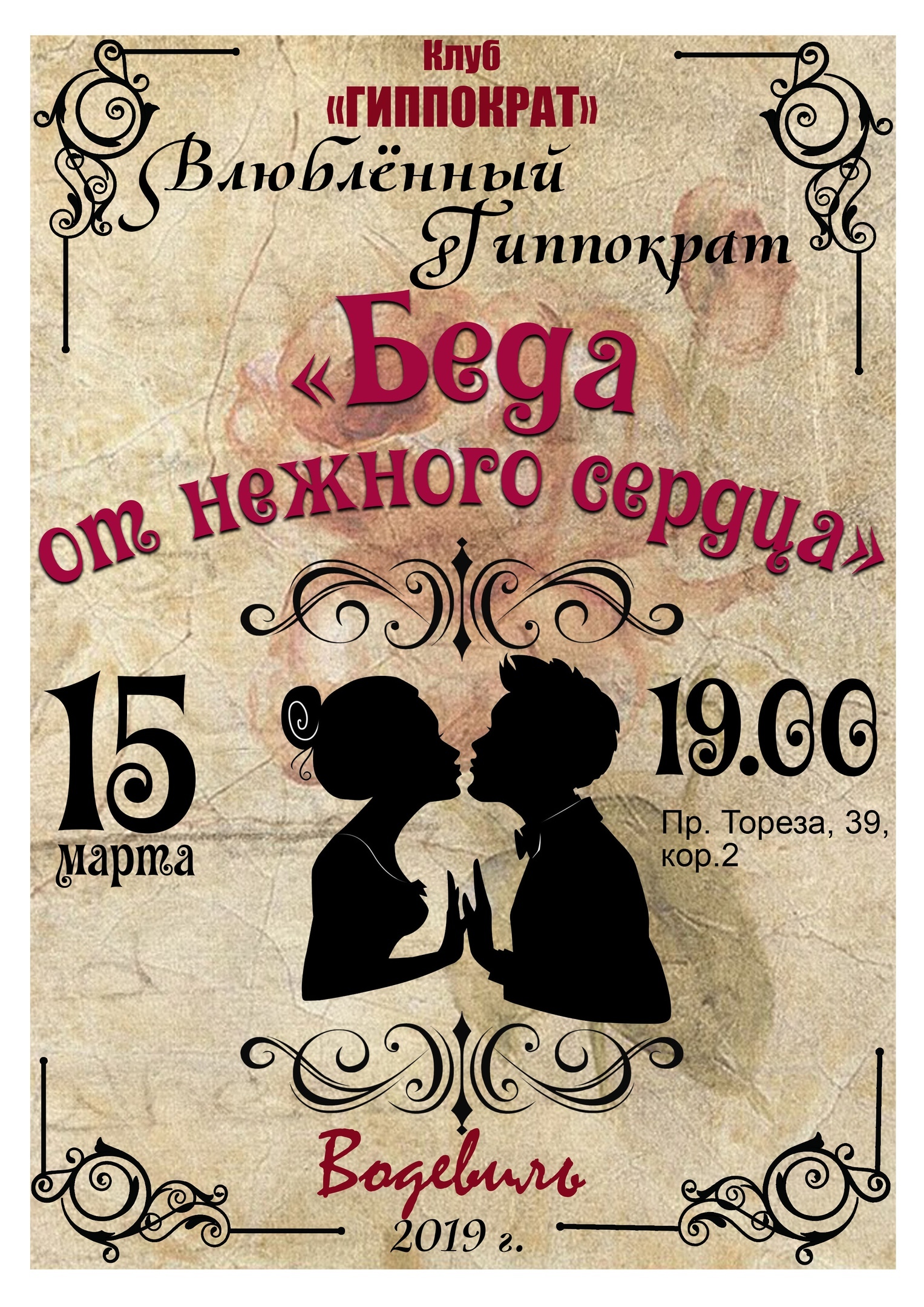 15 марта в 19.00 на сцене студенческого клуба «Гиппократ» пройдет представление «Беда от нежного сердца»! Приглашаются все желающие!