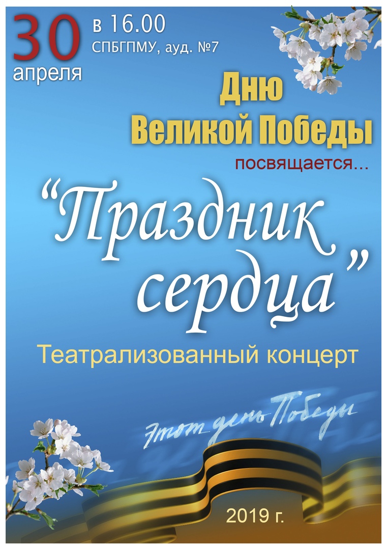 30 апреля в 16:00 в аудитории №7 состоится праздничный концерт, посвященный наступающему Дню Победы!