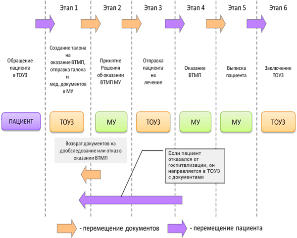 Чтобы получить направление на прохождение лечения в федеральное специализированное медицинское учреждение, нужно обратиться в ТОУЗ — территориальный орган управления (Комитет, Департамент, Министерство) здравоохранения по месту постоянной регистрации. Заявку рассмотрит комиссия по отбору и направлению больных для получения Высокотехнологичной медицинской помощи в федеральные специализированные медицинские учреждения. При наличии медицинских показаний документы будут рассмотрены в профильном федеральном специализированном медицинском учреждении (МУ) и будет определена дата госпитализации.