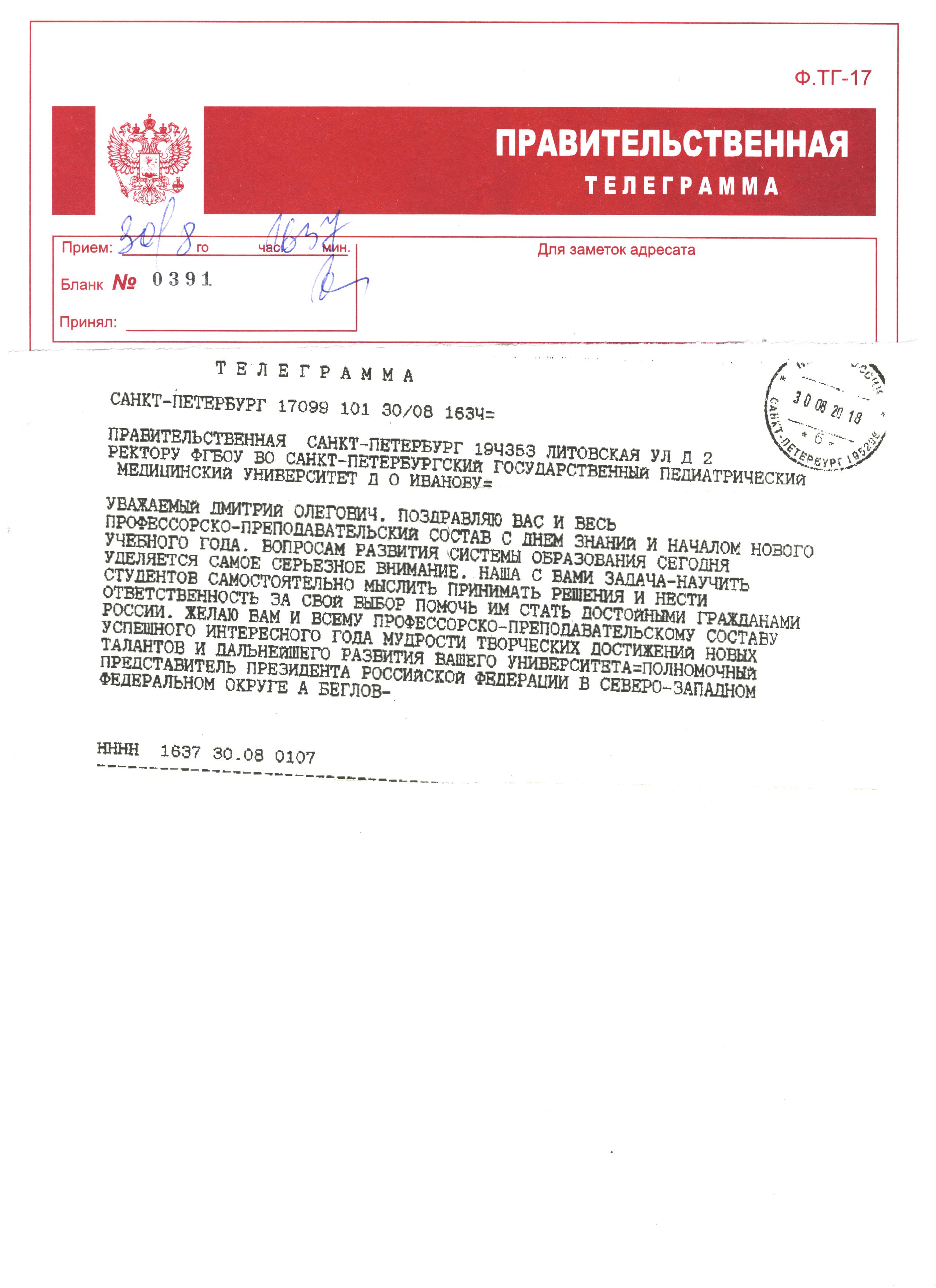 Поздравительная телеграмма с Днем знаний от Уполномоченного представителя Президента РФ в СЗФО А. Беглова