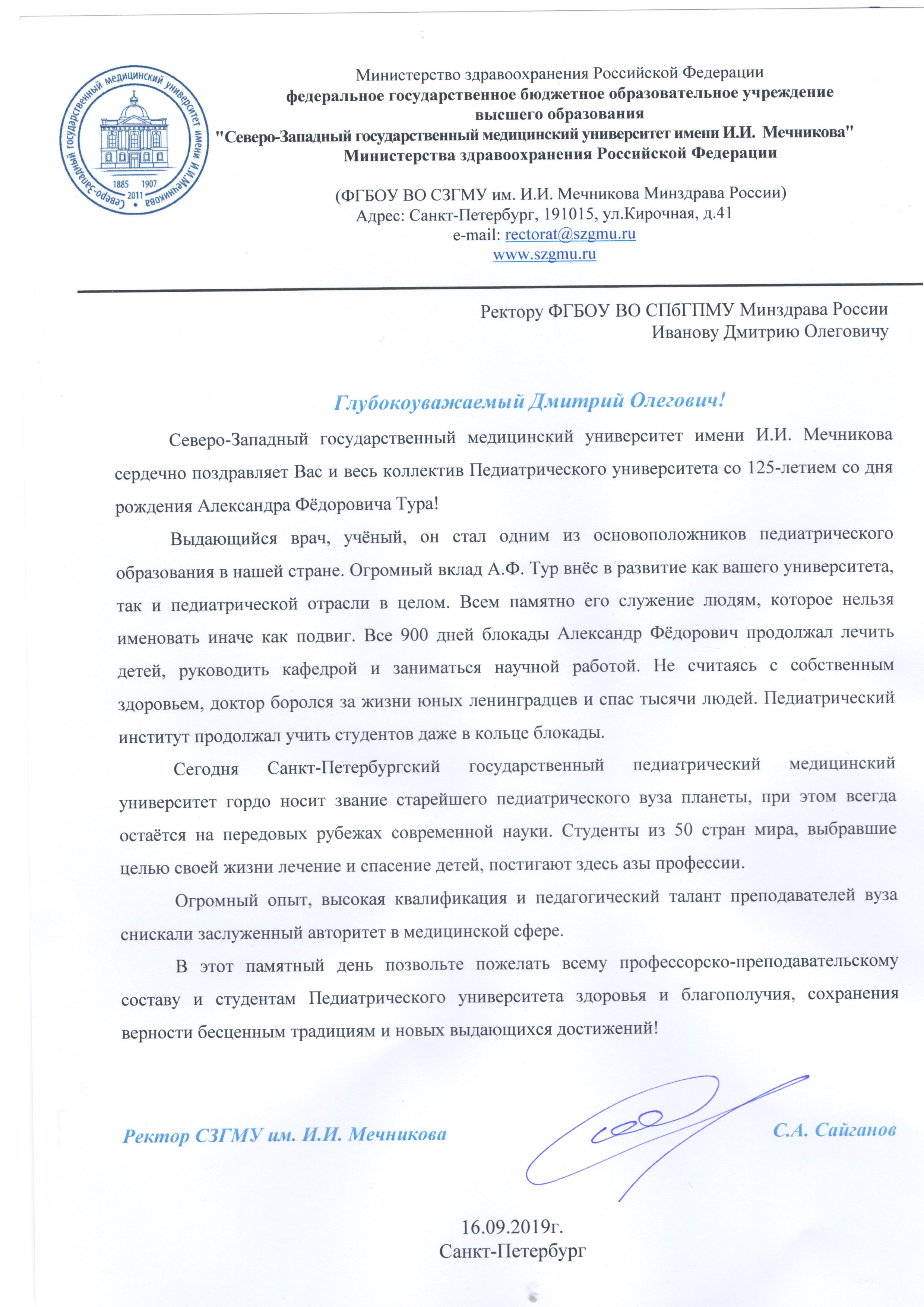 Поздравление с днем рождения ректора СПбГПМУ Иванова Д.О.