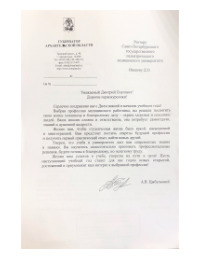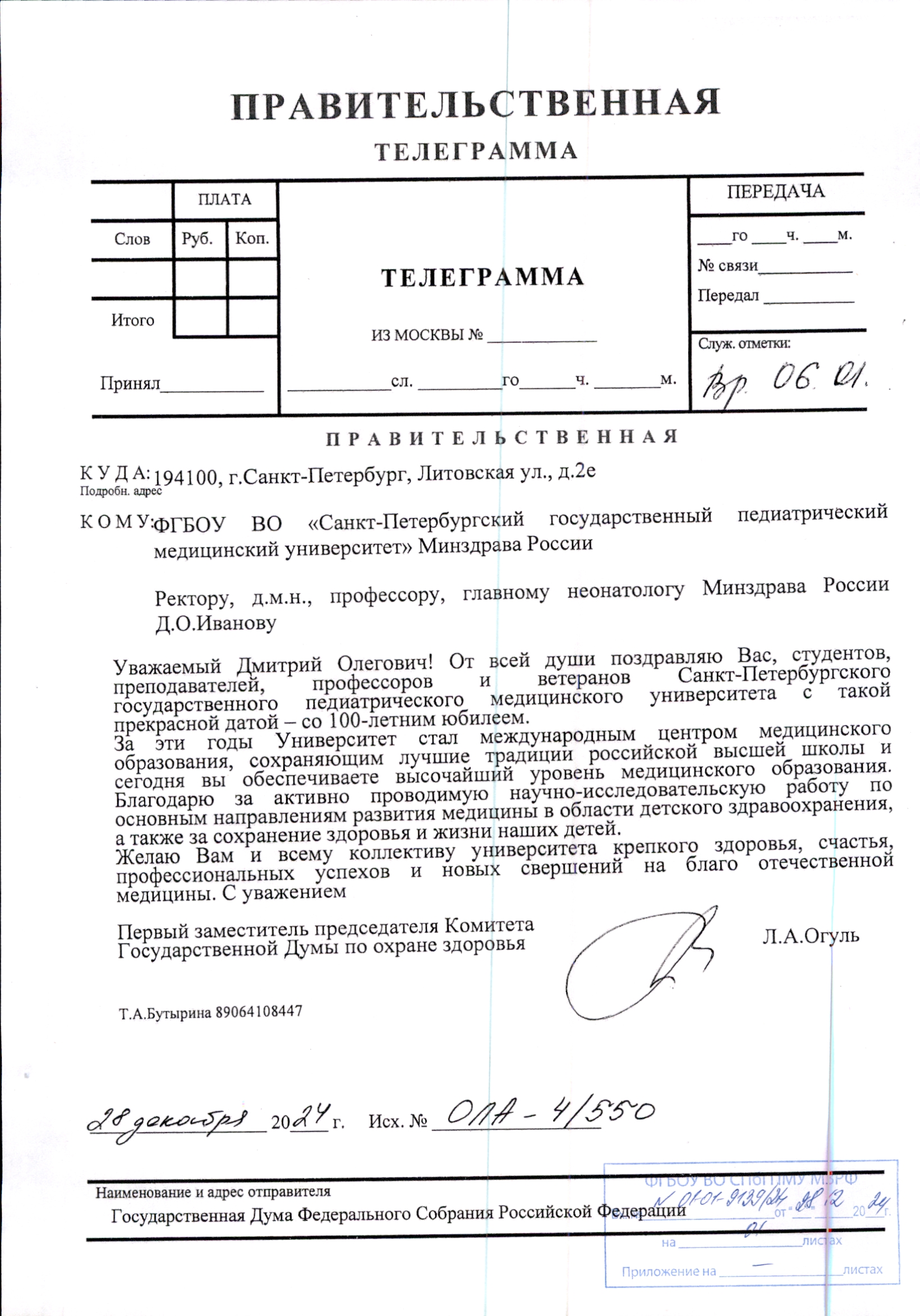 Правительственная телеграмма от Председателя комитета по охране здоровья Государственной Думы РФ Д.А. Морозова с поздравлением в адрес вуза в честь 94-летия СПбГПМУ и 114-летия Клиники вуза