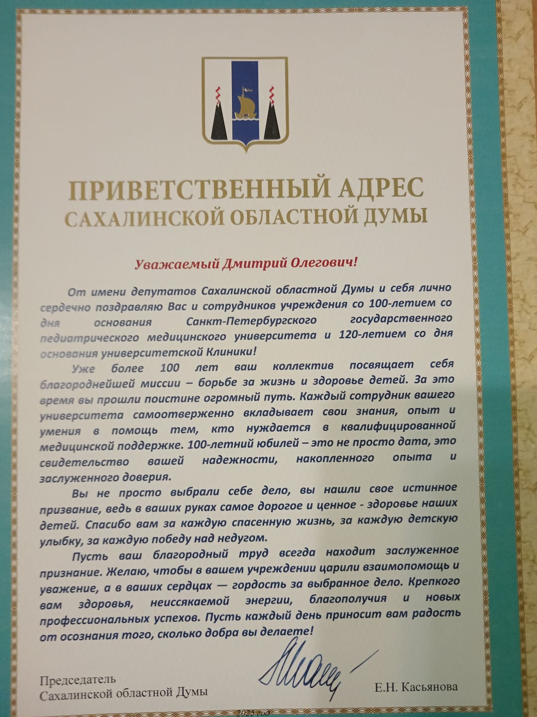 Поздравление председателя Сахалинской областной думы Е.Н. Касьяновой